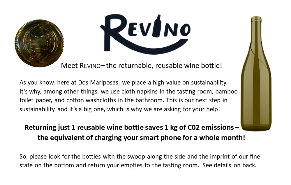 Bottle of Dos Mariposas 2017 Pinot Noir nestled in a bed of lavender. Text reads Wine Club Now Available.